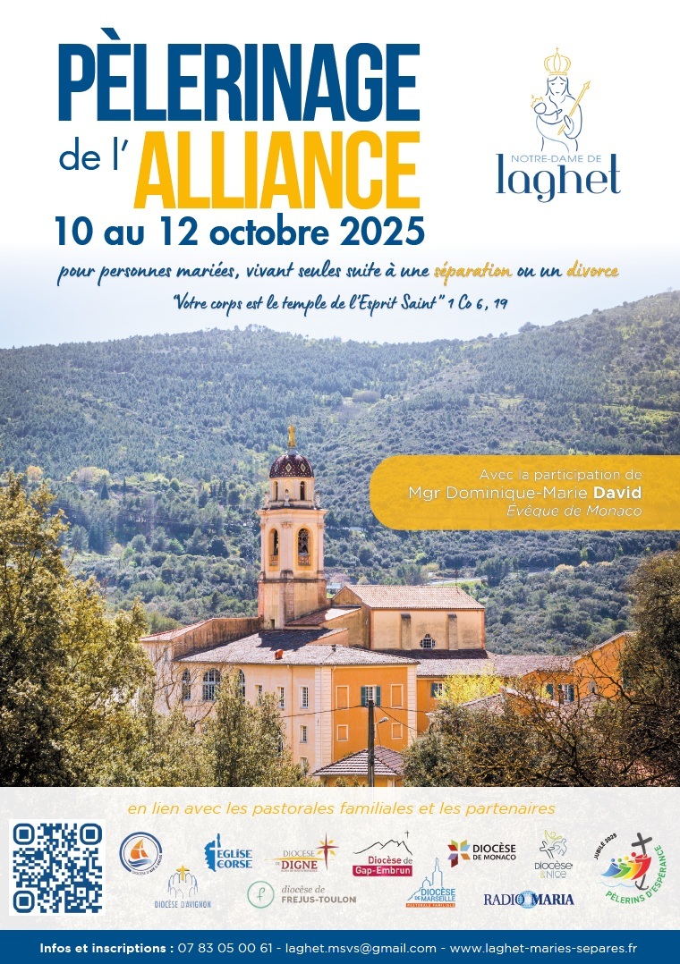 Qui est concerné ? Toute personne mariée sacramentellement et vivant seule (avec ou sans enfant) à la suite d’une séparation conjugale (en cours, récente ou déjà ancienne) et qui souhaite auprès de Notre-Dame de Laghet, avancer en mettant toute sa confiance en son Fils Jésus-Christ. Des prêtres (cf. intervenants en lien ici) seront présents pour vous accompagner, administrer les sacrements et assurer une prédication appuyée sur la sagesse de l’Eglise (cf. programme du pèlerinage : https://www.laghet-maries-separes.fr/programme/